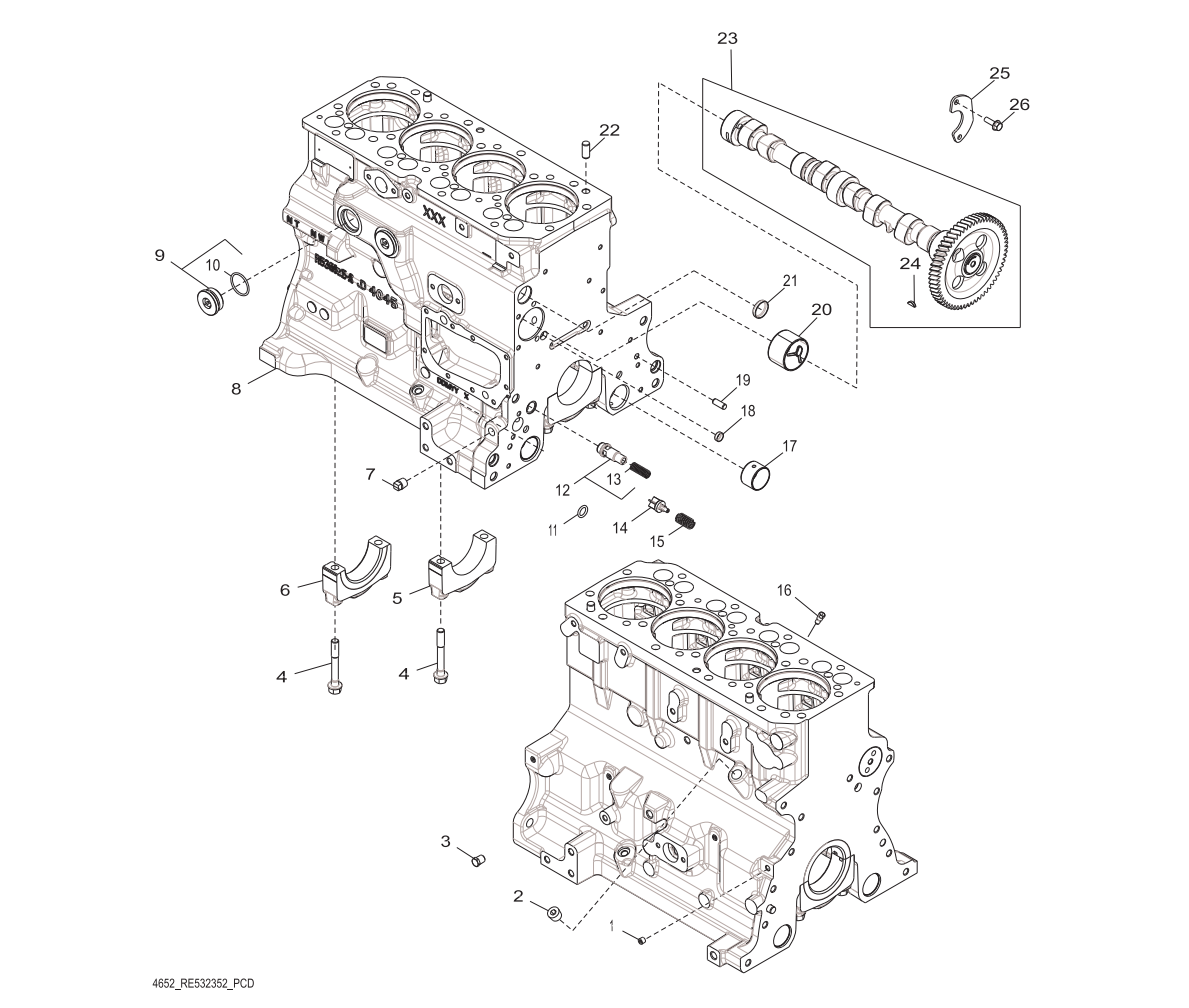 Item Part Description Quantity Variation Number 4652 1 224268 Pipe Plug 1 2 # Pipe Plug, 1/2” 1 3 223802 Pipe Plug 10 4 GM86407 Cap Screw 4 5 360084 Bearing Cap, Main Bearing 1 6 GM86408 Bearing Cap 1 7 # Pipe Plug, 3/8” 1 8 - Cylinder Block 1 9 GM32824 Plug 2 10 223988 O-Ring 1 11 336458 O-Ring 1 12 GM32810 Valve 1 13 GM17452 Compression Spring 1 14 360103 Valve, Engine Oil Bypass 1 15 360080 Spring 1 16 360146 Jet 4 17 360519 Bushing 6 18 360517 Cap 2 19 GM49823 Pin, Dowel 2 20 352246 Bushing 1 21 360093 Plug 1 22 GM49822 Pin, Dowel 4 23 GM32813 Camshaft 1 24 360158 Key, Shaft 1 25 360154 Plate, Thrust 1 26 # Screw, M8 X 25 2